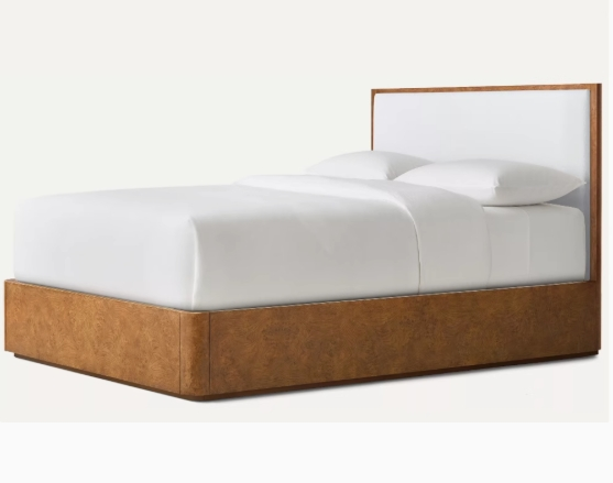 La cabecera está tapizada en una elegante tela blanca, que proporciona un contraste limpio y contemporáneo con la base texturizada. Es simple pero elegante, ofreciendo un cómodo telón de fondo para apoyar almohadas. La cama está vestida con ropa de cama blanca crujiente, mejorando la sensación de limpieza y relajación. Esta combinación de la base distintiva de Burl - Effect y la cabecera blanca minimalista y la ropa de cama resulta en una cama que es una pieza de declaración y un refugio para descansar, combinando el diseño moderno con un encanto natural.
