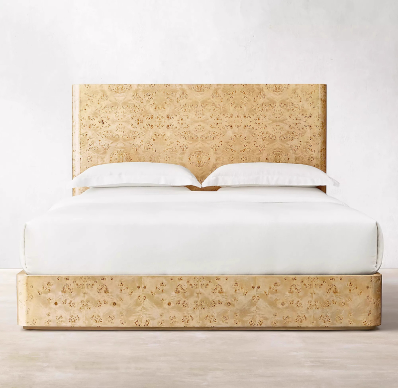 La chapa de madera de Burl: las texturas naturalmente formadas e irregulares y los tonos dorados de luz entretejidos y oscuros son como 'Registros congelados de trayectorias de crecimiento natural '. Infunden la cama con encanto artístico irreproducible, haciendo 'lujo natural' el tono fundamental del estilo.