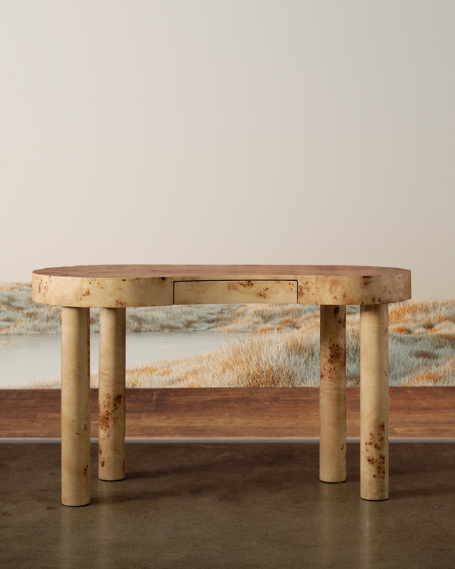 Esta es una mesa distintiva. Hecho de madera con texturas de burl, tiene un tono de madera ligera que exuda una sensación simple y natural. La mesa ovalada se combina con cuatro patas cilíndricas, creando una forma suave y minimalista. Hay un solo cajón en el medio, que es funcional para el almacenamiento y decorativo. En general, combina la simplicidad natural con un toque artístico, agregando encanto único al espacio y se ajusta bien a varios estilos de hogar que valoran la naturaleza y un sentido del estilo.