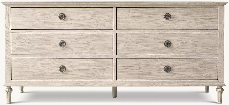 El tocador se encuentra en las patas del huso intrincadamente talladas, un sello distintivo del diseño provincial francés. Estas piernas agregan interés vertical y un toque de arte artesanal, elevando la pieza más allá del almacenamiento básico. Los paneles de moldeo de corona y cajones empotrados del gabinete refinan aún más su silueta, haciéndose eco de los detalles de los muebles franceses del siglo XVIII.