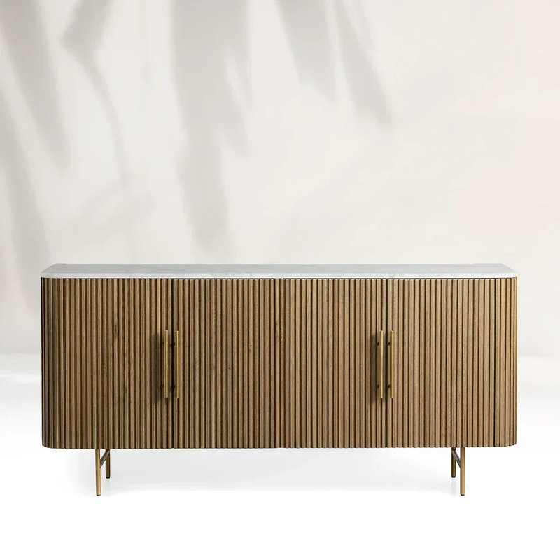 Este gabinete de televisión de roble blanco presenta una parte superior hecha de lujo de mármol natural. El mármol, con sus patrones de vetas únicos que se asemejan a las delicadas corrientes que serpentean a través de un paisaje, agrega un aire de elegancia y sofisticación. Cada losa es una, de - A -, asegurando que su gabinete de TV sea realmente distintivo. El toque fresco y suave del mármol contrasta maravillosamente con la textura cálida y granulada de la base de roble blanco, creando una mezcla armoniosa de materiales. La parte superior de mármol natural no solo sirve como un punto focal impresionante, sino que también ofrece una excelente resistencia al calor, lo que lo hace perfecto para colocar dispositivos de medios. Es una combinación que combina la funcionalidad con la estética de alto final, que mejora el encanto general de su sala de estar.