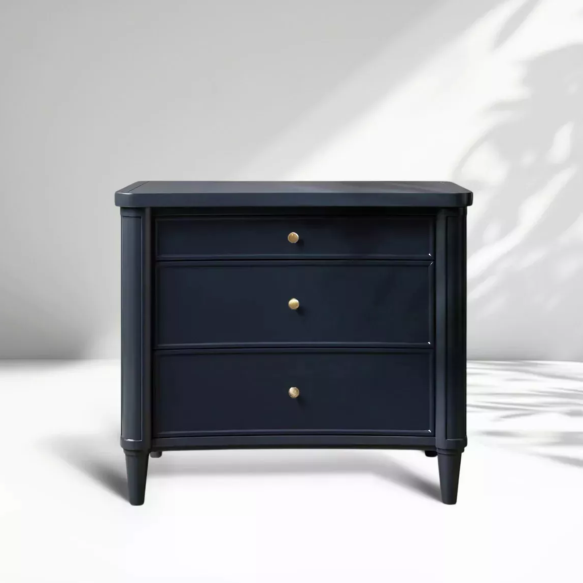 La mesa de la noche azul oscuro exuda un encanto único de nobleza y misterio. El rico y profundo color azul oscuro combina la tranquilidad del azul con un toque de elegancia misteriosa y noble. El material de madera maciza le da al azul oscuro una sensación más cálida, ya no es frío. Colocado en el dormitorio, puede crear un ambiente elegante y noble, como si creara un espacio privado exclusivo, lo que permite a los ocupantes sentir una sensación única de dignidad y comodidad.