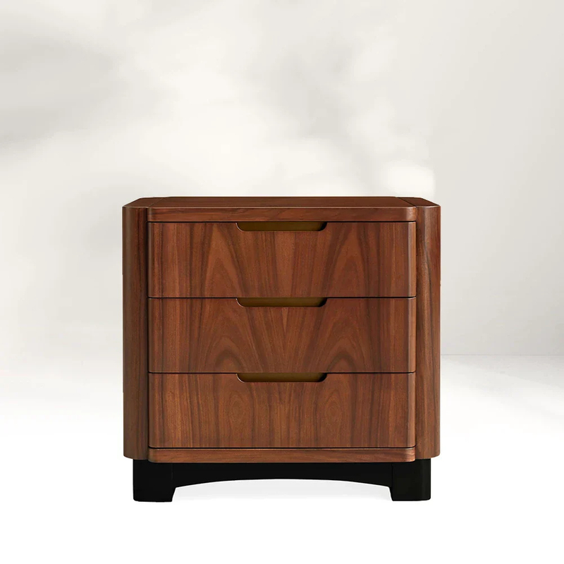 Esta mesita de noche muestra un diseño refinado, con un rico cuerpo de madera con un acabado suave y pulido que resalta los patrones de grano natural de la madera. Sus tres cajones, equipados con mangos sutilmente integrados, ofrecen tanto funcionalidad como una estética elegante. La base oscura contrastante agrega un toque de elegancia moderna, lo que lo convierte en una pieza versátil que complementa varios estilos de dormitorio al tiempo que proporciona espacio de almacenamiento conveniente.