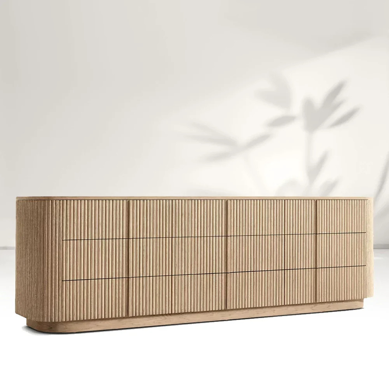 Superficie de madera acanalada: pase la mano a lo largo de su superficie. Los surcos verticales son como las respiraciones suaves y controladas de la madera. Cada surco, cortado con el cabello: precisión de ancho (3 mm de ancho, 2 mm de profundidad), trampa la luz en líneas delgadas, convirtiendo el gabinete en un lienzo de sombras y calidez. Dentro de estas ranuras, el grano de madera se desarrolla como un paisaje en miniatura, con un nudo aquí y un débil cambio de color allí, como si el bosque en sí fuera condensado en estas tiras verticales.